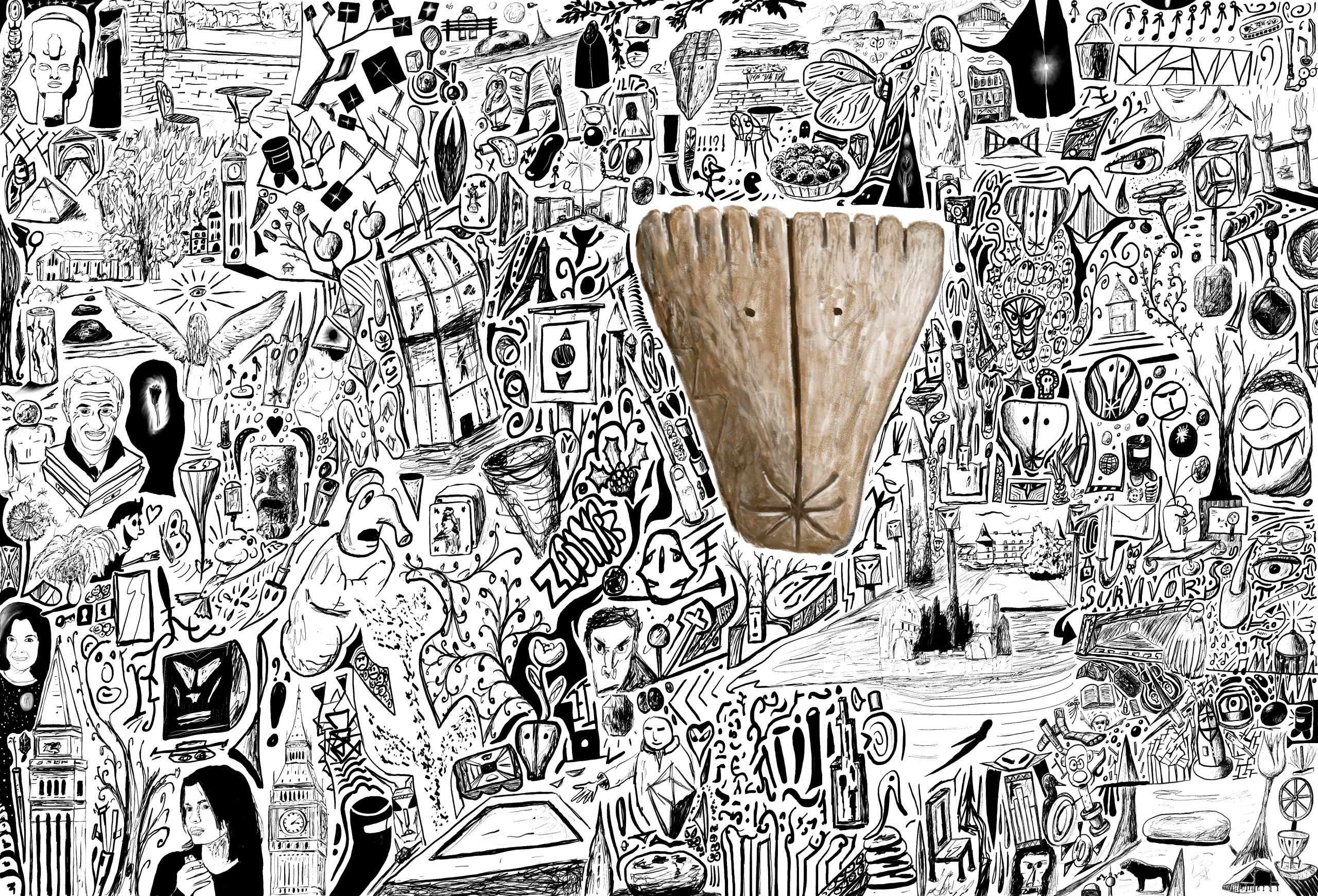 La fresque du Dieu Préhistorique commence par la reproduction d’un véritable cailloux gravé représentant un dieu ancien. Elle s’étend dans toutes les directions sans aucune autre considération que la volonté créative de l’auteur, unique dieu de cet univers aux quatre côtés.