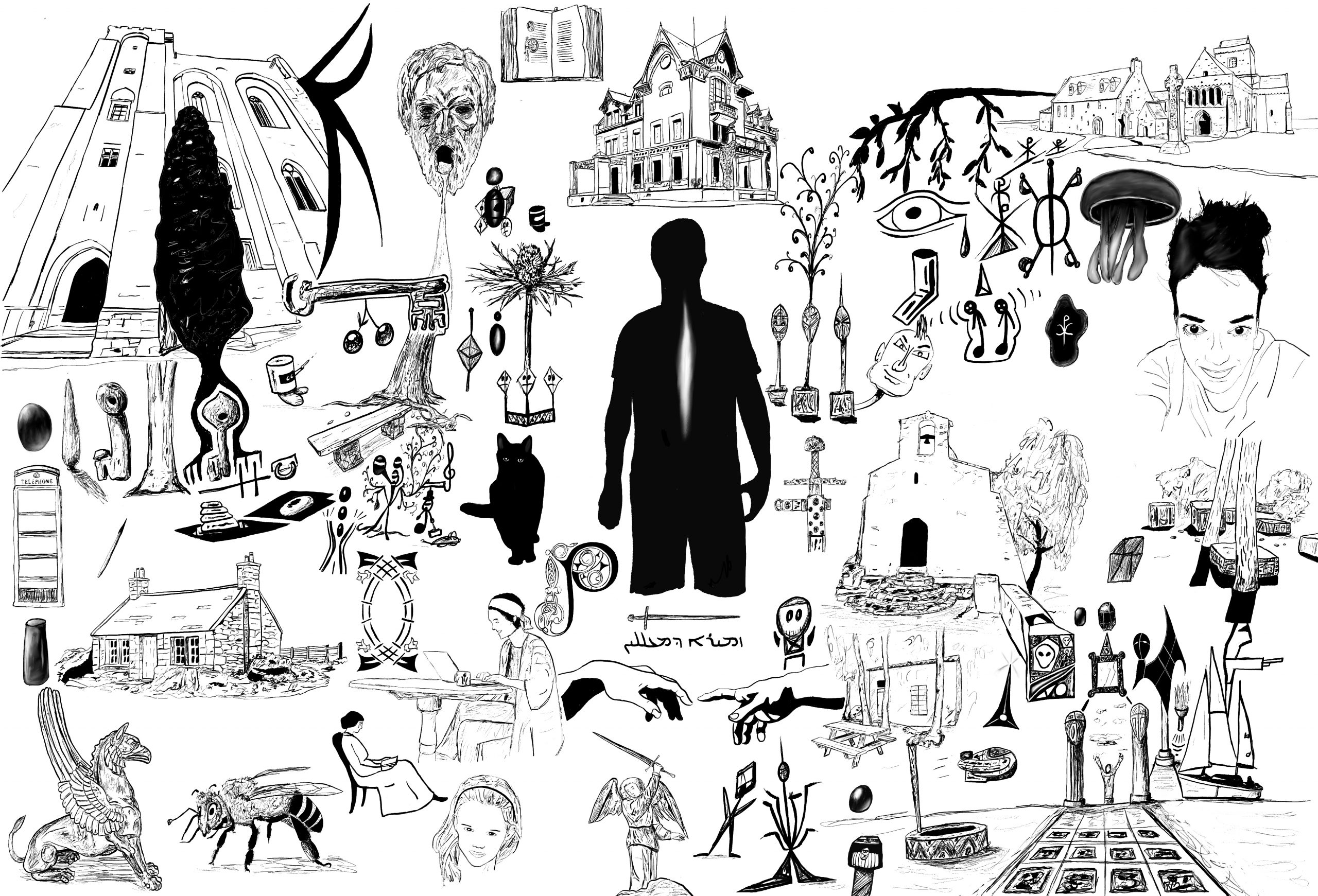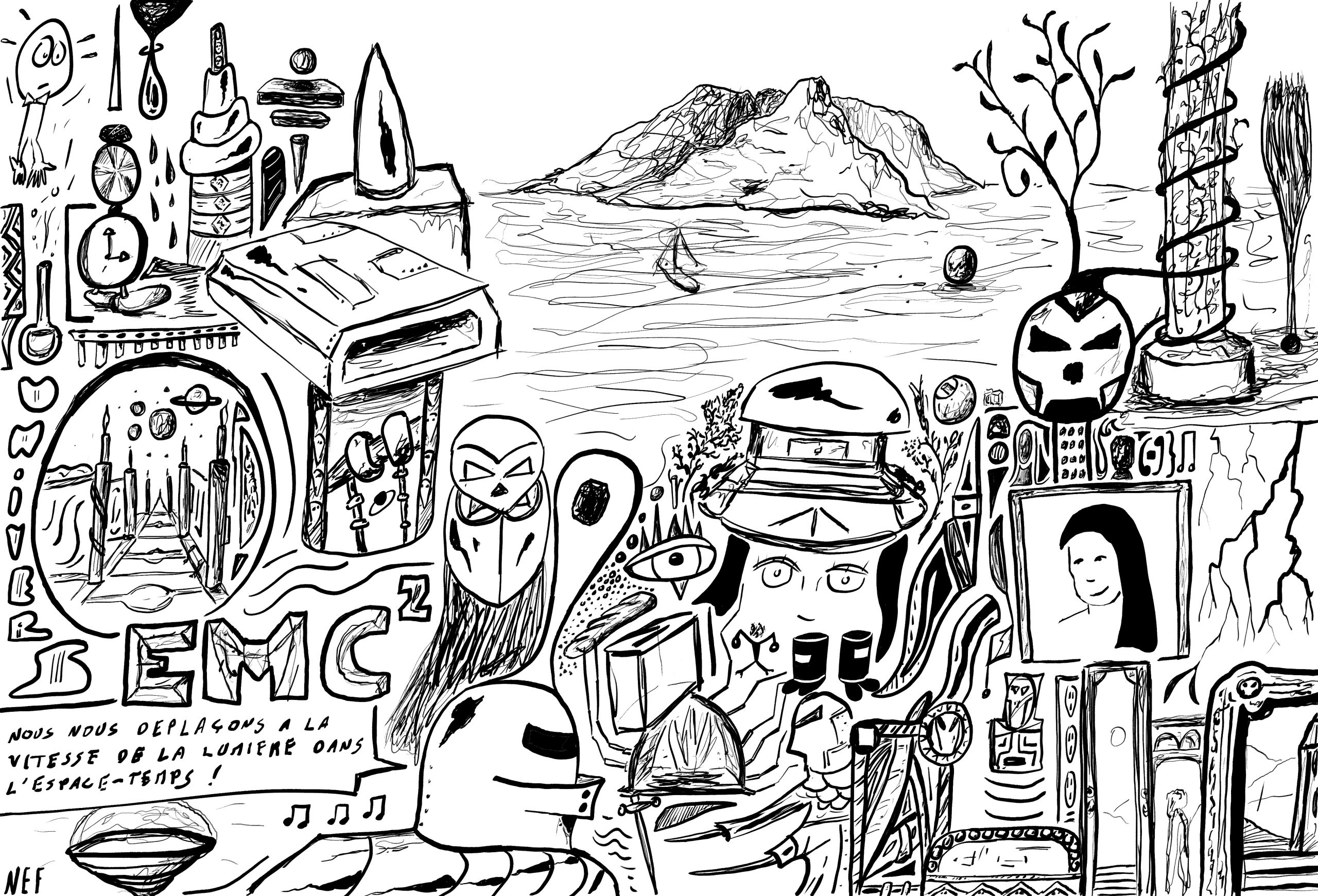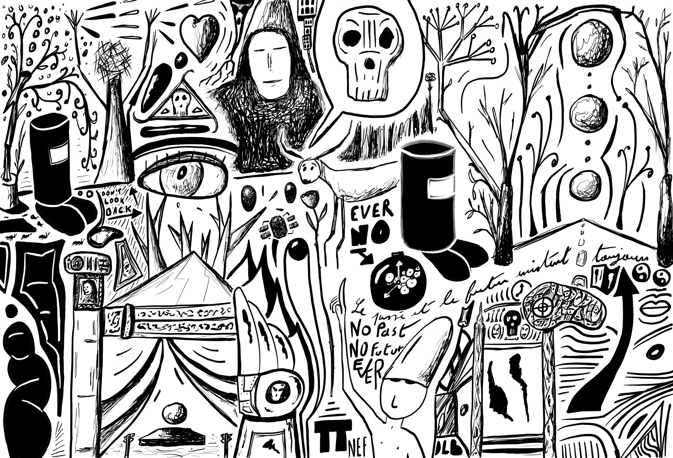 Les fresques sont constituées de dessins, des griffonnages, de formes et d’idées agglomérées au gré du temps. Inspirées par des choses vues, des idées soudaines, des réminiscences, des réflexions graphiques, sans plan établi à l’avance, comme on voyage au gré de ses envies empruntant un passage puis un chemin.