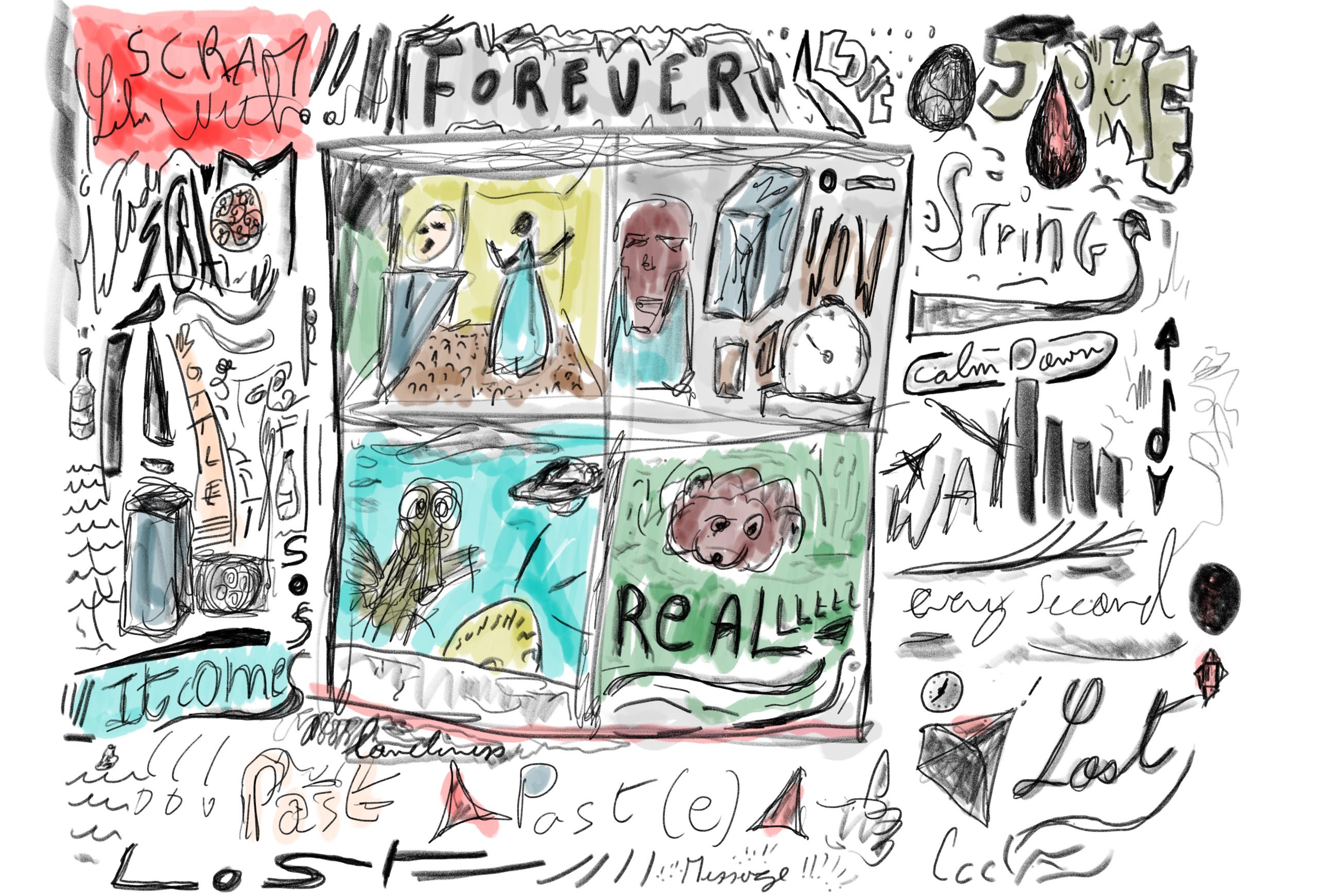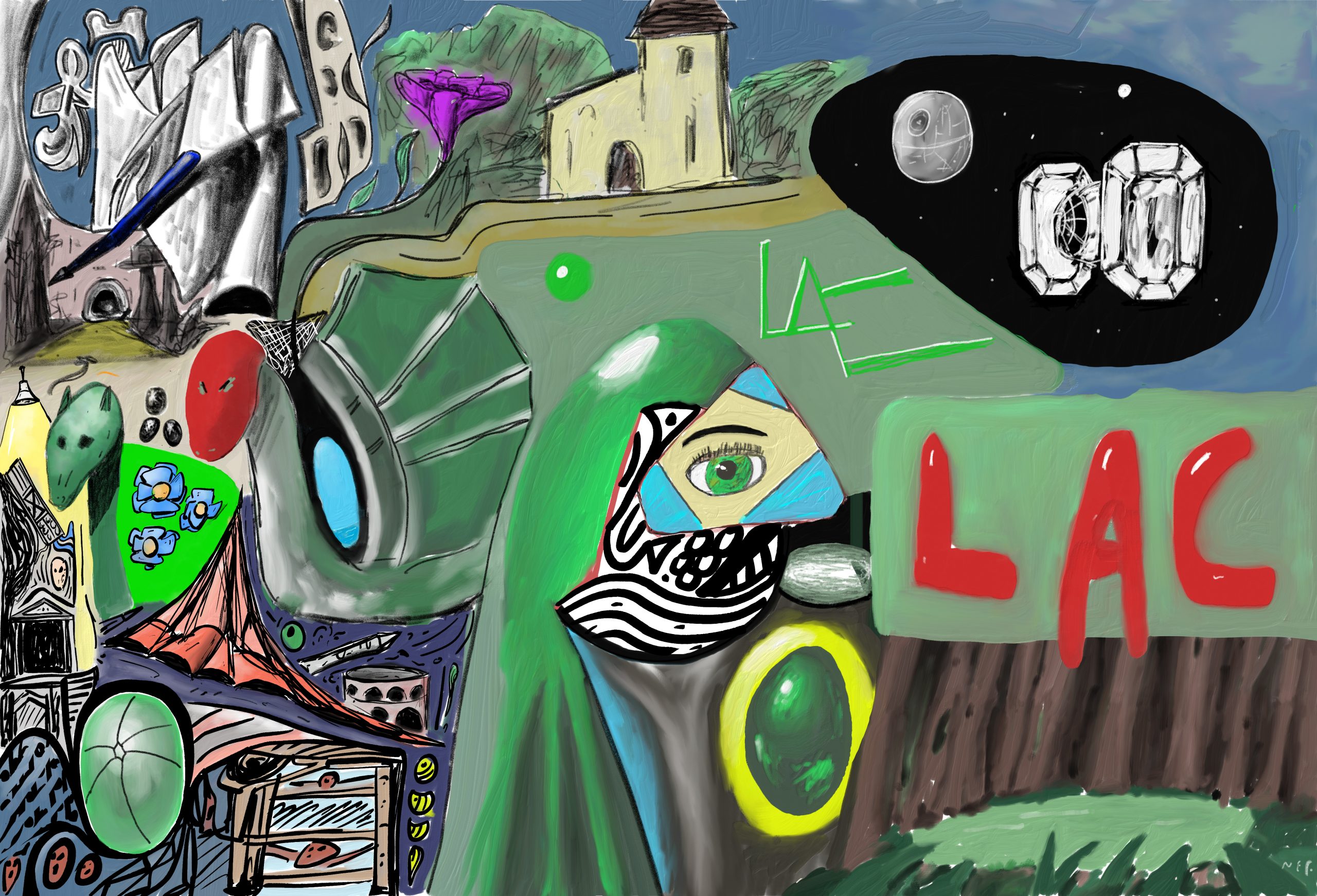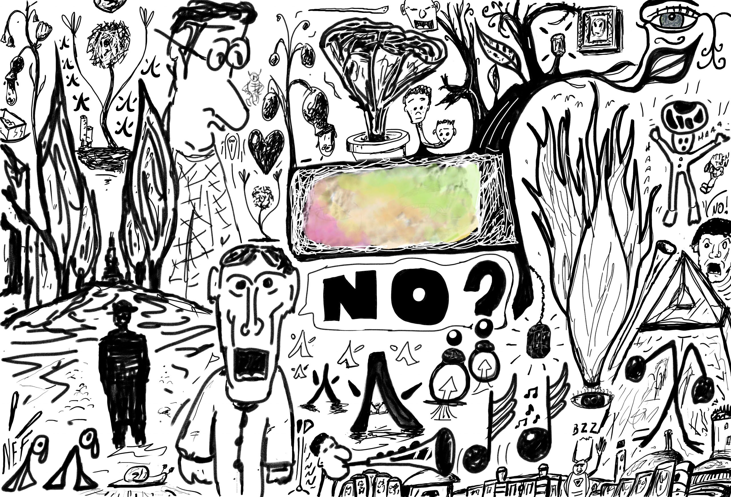 Les fresques sont constituées de dessins, des griffonnages, de formes et d’idées agglomérées au gré du temps. Inspirées par des choses vues, des idées soudaines, des réminiscences, des réflexions graphiques, sans plan établi à l’avance, comme on voyage au gré de ses envies empruntant un passage puis un chemin.