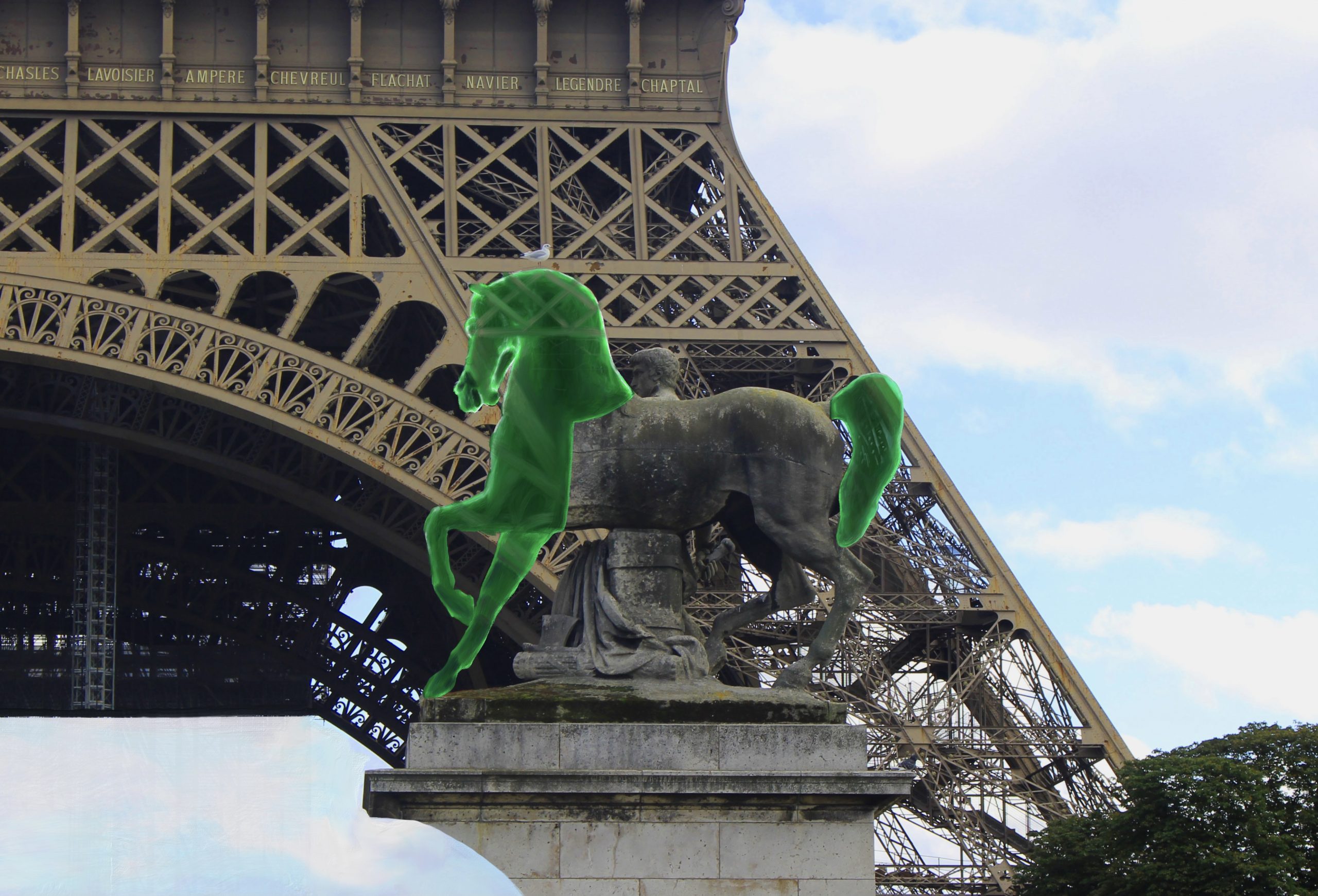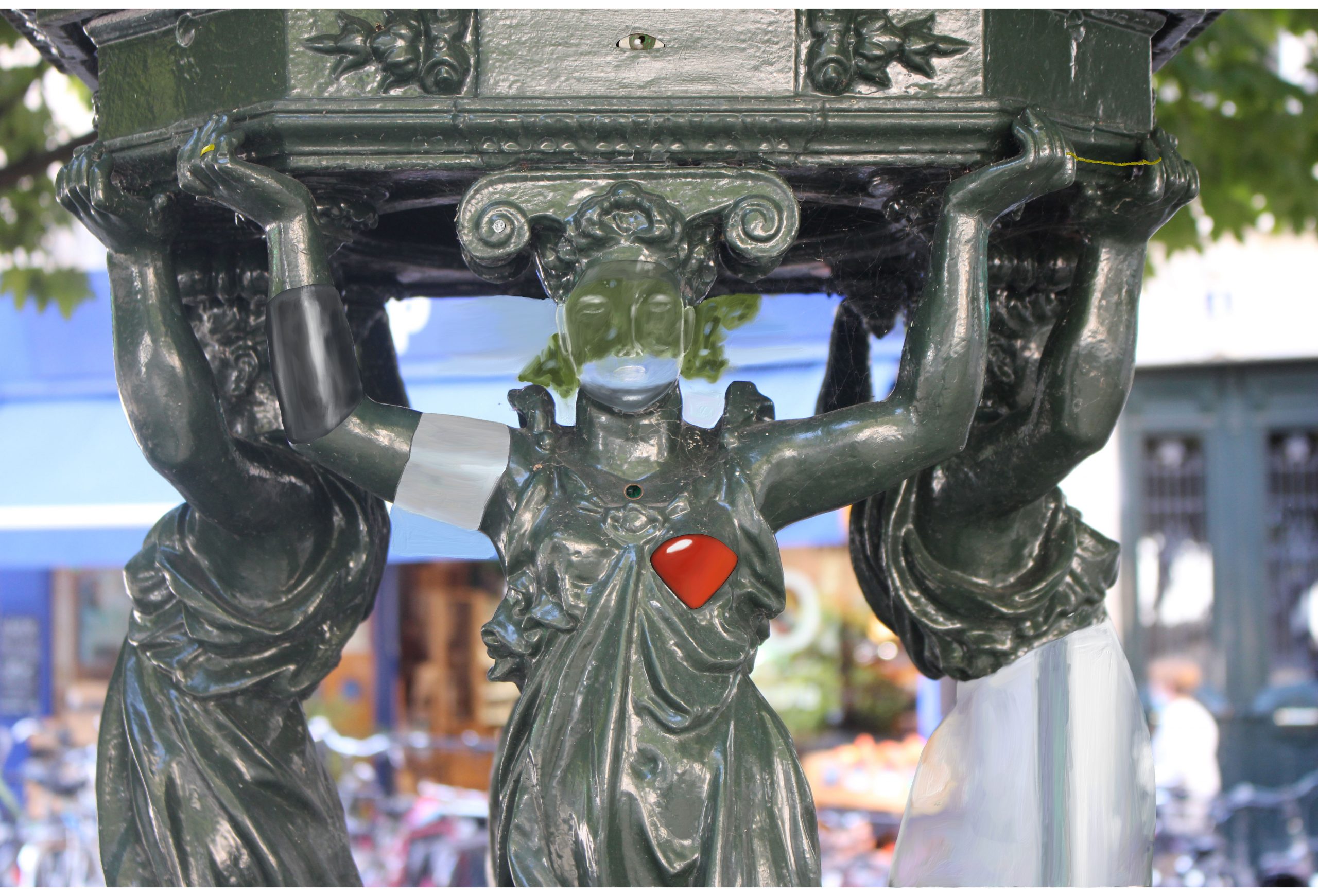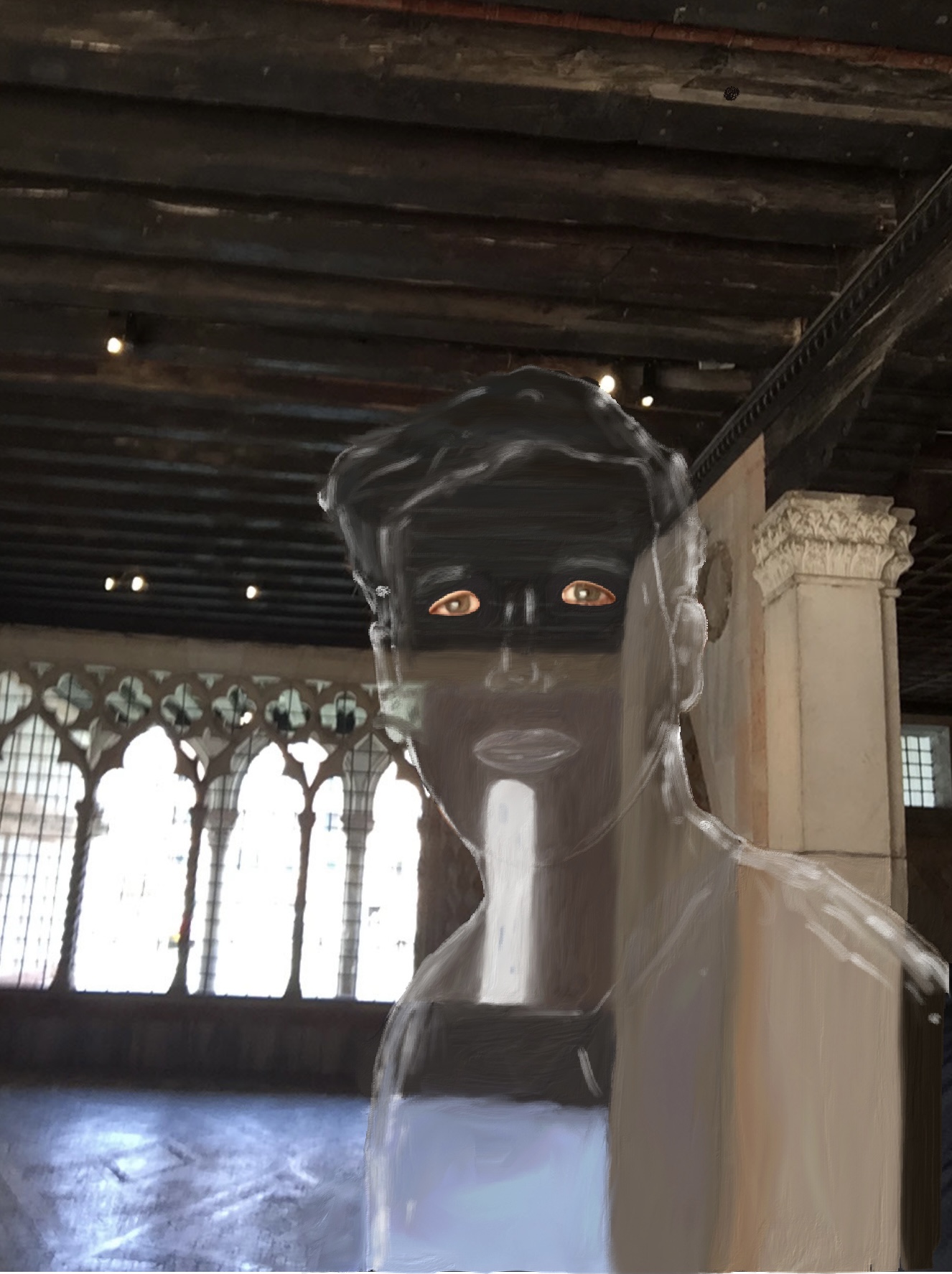Cette série est partie d’une réflexion sur la transparence. Rendre transparent une partie d’une photo, ce n’est pas effacer, c’est tenter de représenter deux objets simultanément, l’objet disparu et le décor, derrière. C’est particulièrement visible dans l’éternelle idole, où l’homme sculpté s’efface pour laisser apparaitre la femme derrière lui, ce qu’il est impossible de voir dans la réalité. Effacer pour mieux montrer, pour unir aussi.